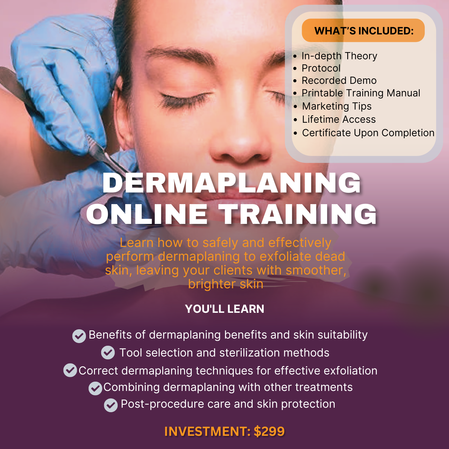 This comprehensive Dermaplaning course is designed to equip skincare professionals with the skills and knowledge to perform safe and effective dermaplaning treatments. Dermaplaning is a popular exfoliation technique that involves using a sterile surgical blade to remove dead skin cells and fine vellus hair, revealing smoother, brighter skin.